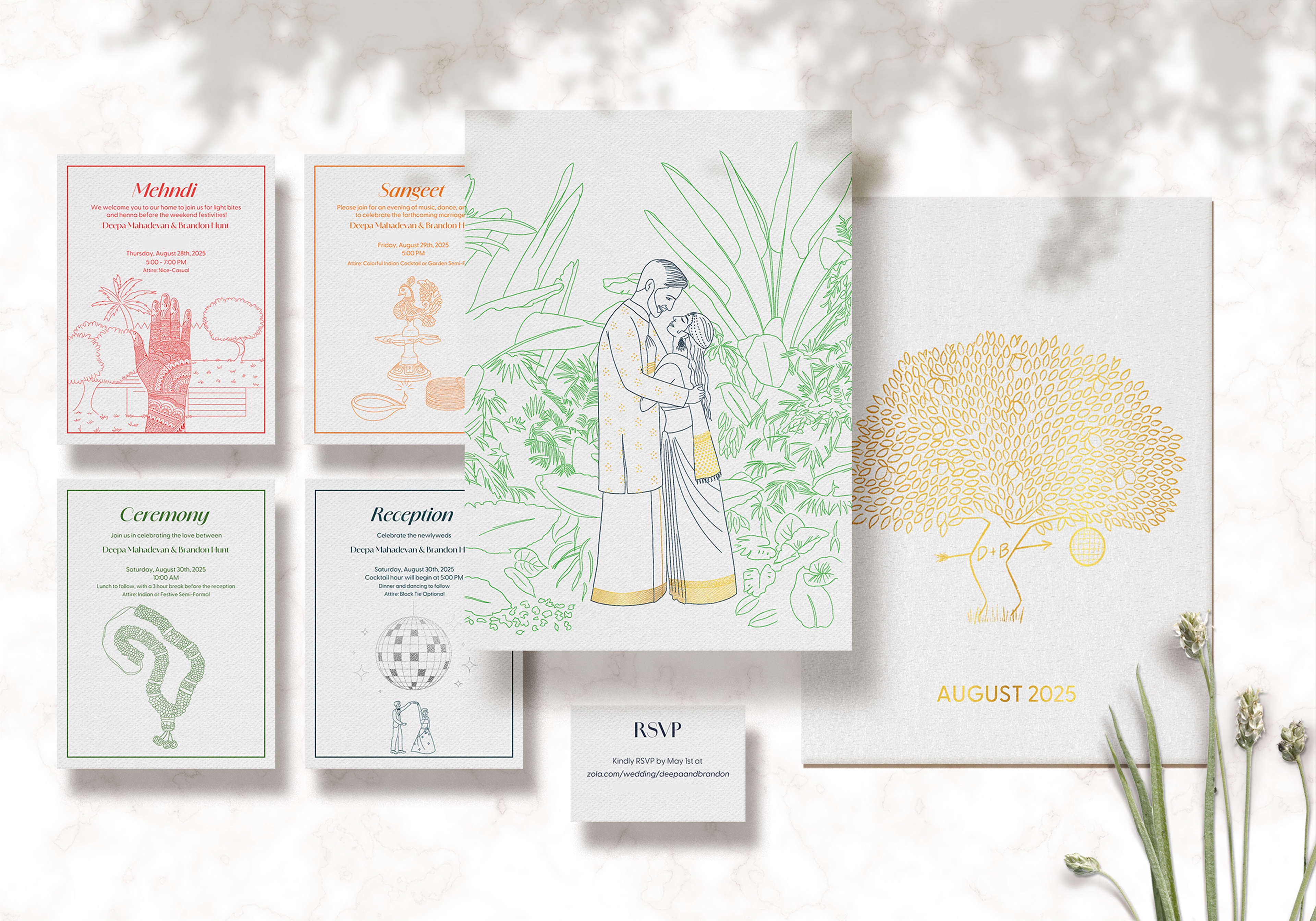 Traditional Indian weddings consist of multiple events with different cultural significance, I created illustrations incorporating elements of each tradition for each.